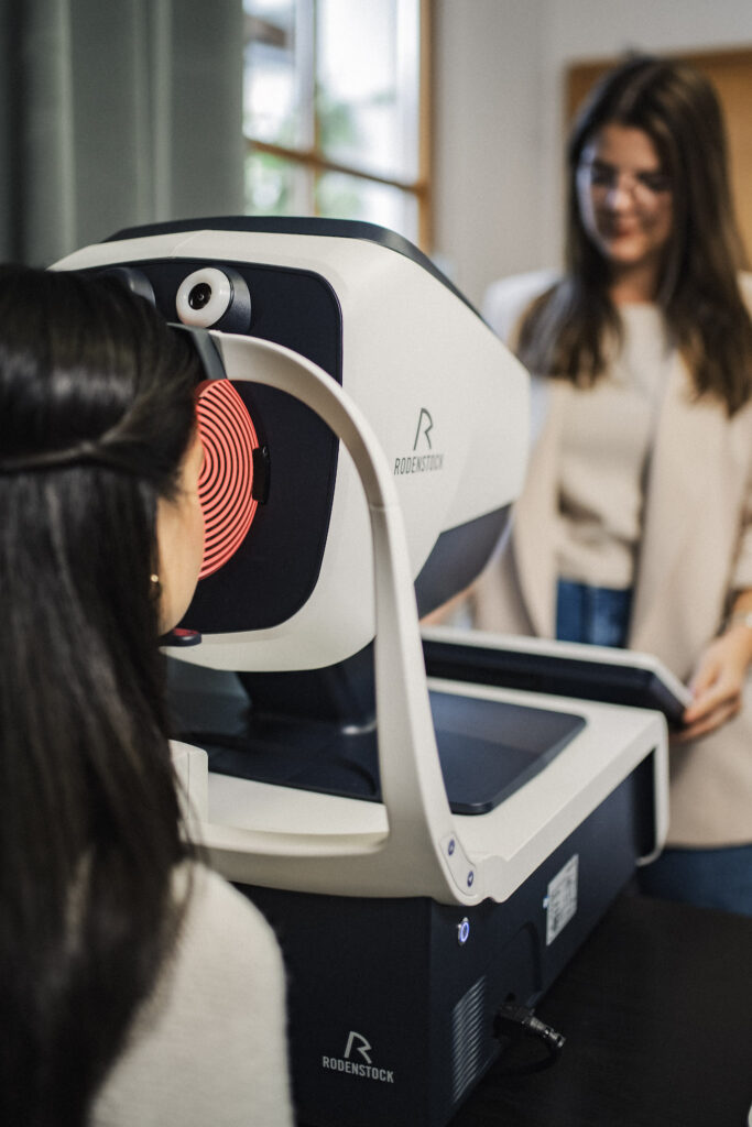Mit dem DNEye® Scanner von Rodenstock wird Ihr Auge präzise biometrisch vermessen, um ein exaktes Modell zu erstellen. Dieses Verfahren berücksichtigt individuelle Parameter wie Pupillenreaktion, Sehfehler und Kontrastempfinden, die herkömmliche Methoden übersehen. Das Ergebnis: maßgefertigte Brillengläser, die Ihr Sehen optimieren – für maximale Schärfe, Kontraste und ein natürliches Seherlebnis, selbst in der Dämmerung.